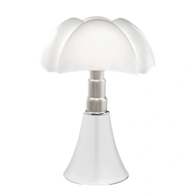 Dimmable LED table lamp Pipistrello, height-adjustable Pipistrello is a classic lamp that has not only won multiple awards, but is also exhibited in numerous museums worldwide. Its slim yet striking design is memorable and gives the LED table lamp a unique look with high recognition value. The base is equipped with a telescopic mechanism made of satin-finished stainless steel, which immediately catches the eye. It allows the height of the light to be adjusted from 66 to 86 cm. The semi-circular plastic lampshade sits enthroned on this striking base and, thanks to its opal surface, produces a diffuse light that is emitted all around the room. Divided into four elements, the lampshade also looks very elegant and unique. The brightness of the light is adjustable using the integrated dimmer on the cable, allowing Pipistrello to adapt to the situation and create a cosy atmosphere for relaxation in addition to pleasant general lighting. The origins of this series date back to 1965. Pipistrello was created by Italian designer and architect Gaetana "Gae" Aulenti (1927-2012) for the manufacturer Martinelli Luce, which still produces the table lamp today.