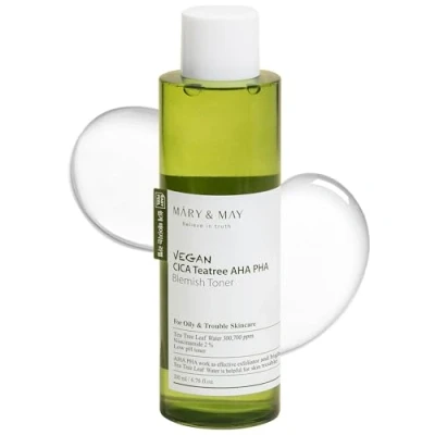 VEGAN OIL CONTROL AND SOOTHING EXFOLIATION: The Vegan Cica Tea Tree AHA PHA Blemish Toner is designed to control oil and provide soothing exfoliation. Its vegan formula includes natural tea tree leaf water and AHA PHA to gently remove dead skin cells, manage sebum production, and brighten blemishes, while maintaining the skin's natural moisture balance. KEY INGREDIENTS FOR EFFECTIVE SKINCARE: This toner is power-packed with 300,000 ppm of tea tree leaf water, AHA PHA for cell renewal, niacinamide for sebum control, and traditional oriental herbal extracts from wormwood, pine, and citrus. Together, these ingredients calm irritation and ensure your skin remains clear and moisturized throughout the day. FRESH AND MOISTURIZING CLEAR WATER FORMULA: Enjoy a fresh and hydrating experience with every use. This low-pH toner not only protects the skin barrier but also provides a clear and moist finish. The transparent and fresh tea tree scented water formula effectively wipes off dead skin cells and excess sebum without stripping the skin. HOW TO USE FOR OPTIMAL BENEFITS: Apply the toner morning and night after cleansing. Soak a cotton pad and gently swipe over the face and neck, avoiding the eye area. For enhanced soothing, it can also be used as a toner mask by soaking cotton pads and leaving them on irritated areas for a few minutes. Suitable for daily use to maintain a healthy, radiant complexion. COMMITMENT TO CLEAN BEAUTY FROM KOREA: Proudly hailing from Korea, MARY & MAY embodies the essence of clean beauty with a conscience. Our products are not only vegan and cruelty-free but also made with all EWG green grade ingredients. We are dedicated to eco-friendly practices, utilizing 100% recycled paper and soybean oil ink for our packaging. This commitment reflects our deep respect for both skin health and environmental sustainability.