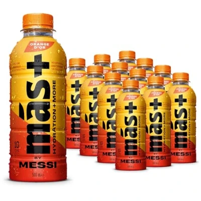Más+ by Messi Positive Hydration- each 500ml bottle delivers a balanced blend of electrolytes, vitamins, minerals, and antioxidants, with 1g of sugar and only 10 calories Orange d’Or has a refreshing orange and tangerine flavour, and a balanced citrus taste. A balanced blend of electrolytes, (sodium, magnesium, potassium, and calcium), vitamins, (B3, B6, B12, A, C, E), minerals, (sodium, calcium, zinc, potassium, magnesium), and antioxidants, (C, E, A) Natural flavours with no artificial sweeteners or colours. All of the good, none of the bad. Inspired by Messi himself to provide a hydration beverage for everyone, for any occasion