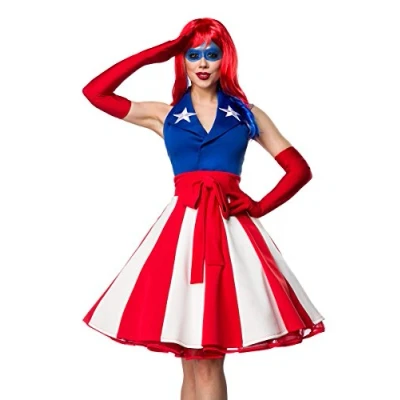 Beautiful, high-quality costume from Mask Paradise The costume set in stars and stripes inspired design consists of: a dress and elegant satin gloves The costume is made from: 80% polyester, 20% elastane, gloves: 100% polyester The dress has a side length of approx. 72 cm Other extras: generous halterneck shawl collar, appliqued star embroidery, flared skirt part, with attached bow, fine zip in the side seam, Manufacturer: Mask Paradise
