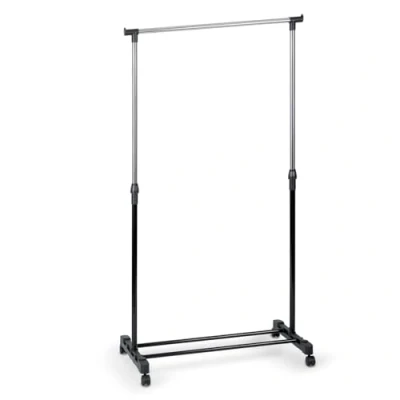 Compact and stylish clothes rack that fits perfectly where every inch of space counts. Two handy shelves help organize shoes - from sneakers to slippers, everything has its place. The adjustable length allows the clothes rack to be perfectly adapted to your space and the size of the users. Suitable for children and adults. MOBILITY IS ITS STRENGTH - Four locking casters allow for easy movement at any time. Length: fixed; height: adjustable; max. Load capacity: 10 kg; 2 shelves; weight: < 3 kg; steel construction with wheels.