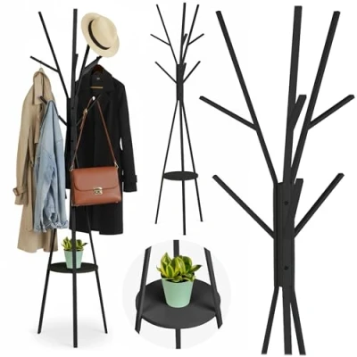 Organised space in no time at all - The Massido coat stand is a functional solution that holds all your jackets, coats and bags. It is ideal for the hallway as well as for the wardrobe. COMFORTABLE HOOKS - The clothes rack offers 9 ergonomic hooks for jackets and coats as well as 3 additional for bags and children's clothing placed at the right height. Practical shelf for accessories - With a shelf that has a load capacity of 5 kg and a diameter of 29 cm, you get additional space for accessories such as bags, glasses, shoes or decorations. STURDY AND AESTHETIC - Thanks to the sturdy metal frame made of steel, the coat rack is stable and supports up to 20 kg. Its minimalist design fits perfectly with modern interiors. SPECIFICATIONS - Height: 181cm, Triangular base, Distance between legs: 40cm, Shelf height: 44cm, Width: 34cm.