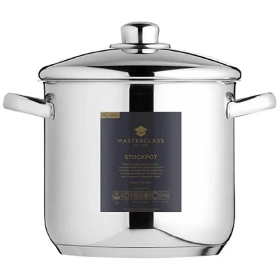 A high-quality stainless steel 14 litre stockpot and lid - suitable for all cooker tops, including induction, gas hobs, solid fuel and AGA / Rayburn Manufactured using the highest-quality mirror-polished stainless steel. Part of the stainless steel cookware range from MasterClass Features a wide, extra-deep saucepan design, making it ideal for cooking stews, soups, casseroles and much more. It's large enough to hold a whole chicken or ham Encapsulated pan base conducts heat evenly for perfect cooking, whilst sturdy side handles make it easy to carry. A versatile kitchen essential Comes protected by the MasterClass 25 year guarantee. Stock pan is dishwasher safe