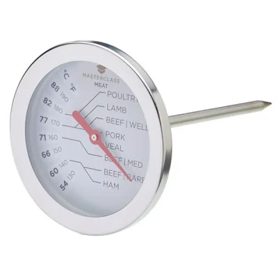 What You'll Get - MasterClass Meat Thermometer Probe, a kitchen essential for ensuring safe and delicious meat cooking Easy-to-Read Dial - With no wires or batteries, simply pierce meat with the probe and check the clear and easy-to-read dial Ideal Cooking Temperatures - Printed with ideal core temperatures for beef, ham, veal, pork, lamb, and poultry to ensure perfect doneness Accurate Readings - Provides temperature readings between 54 and 88 degrees Celsius / 150 and 190 degrees Fahrenheit for precision cooking Quality Guaranteed - Comes with a 5-year guarantee, this stainless steel thermometer is built to last and ensures quality cooking every time
