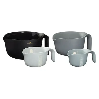 Don't let lack of kitchen space stop you achieving your best; free up some cupboard room with this highly functional 4-in-1 bowl set This combo includes a 30 cm (12 Inch) bowl, a 25 cm (10 Inch) colander and two measuring jugs that all stack together for compact storage Portable; each handsome piece is made from durable, lightweight plastic, complete with ergonomic handle and pouring spout Use the measuring jugs (ml/cups) for wet ingredients, the colander to wash fruit and the mixing bowl to pour cake batter into trays They only take up the space of the largest bowl when stacked; dishwasher and microwave safe; comes with a 5-year guarantee