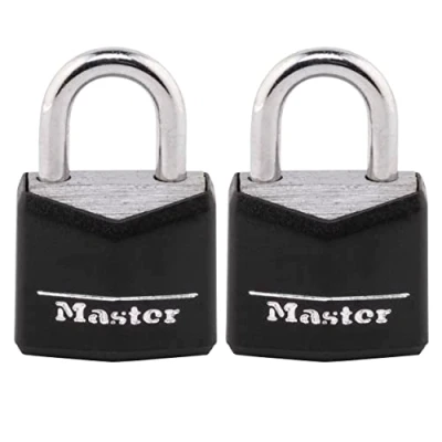 PADLOCK APPLICATION: For indoor use; Small padlock is best used for backpacks, briefcases, and tackle boxes DURABLE DESIGN: Padlock features a black vinyl-covered aluminum body that is scratch and corrosion resistant and a steel shackle SPECIFICATIONS: Lock body is 2.48 in height, 0.75 in width, and 0.49 in. depth; Lock shackle clearance is 0.44 in . long, 0.38 in . width and 0.156 in diameter INCLUDES: Two padlocks, two keys; both keys open both locks (matching color key head for added convenience), Weight: 0.1 pounds, Manufacturer: Master Lock
