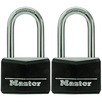 Indoor and outdoor padlock is best used as a shed lock, gate lock, and storage locker lock, providing protection and security from theft Key lock is constructed with a black vinyl-covered aluminum body for scratch and corrosion resistance, hardened steel shackle for cut resistance Four-pin cylinder and dual locking lever mechanism for pick and pry resistance 1-9/16 in. (40 mm) wide lock body; 1/4 in. (6 mm) diameter shackle with 7/8 in. (22 mm) length, 13/16 in. (21 mm) width Includes two padlocks and two keys (matching color key head for added convenience); Both keys open each lock, Manufacturer: Master Lock