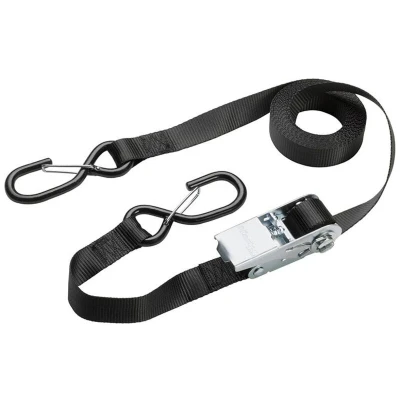 General description Master Lock Ratchet Tie-Down with S-Hooks is designed to secure your luggage or other loads to cars, van roof racks, or trailers. The tie-down features durable black Monster Weave™ polyester webbing, integrated S-Hooks with clips for easy installation, and an elastic strap holder to manage excess strap length. Technical specifications Length: 5m Width: 25mm Breaking Strength: 800kg Load Capacity: 400kg Material: Polyester webbing (UV-resistant) Color: Black Type: Ratchet Compatibility and accessories Includes S-hooks with retention clips for secure attachment Elastic strap holder with toggle for managing excess strap length Installation Attach the S-hooks to secure points on your load or vehicle Use the ratchet mechanism to tighten the webbing until the load is firmly secured Adjust the elastic strap holder to keep excess webbing out of the way Usage Ensure the webbing is properly threaded through the ratchet before tightening Use the ratchet handle to tighten and