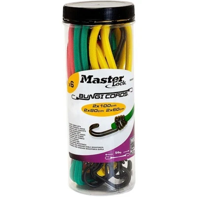 General description The Master Lock Bungee Jar includes 6 pieces of high-quality bungee cords, designed for versatility and strength. This set features two bungees each of 60cm, 80cm, and 100cm lengths, making it suitable for various applications. The reverse twin wire hook design provides enhanced strength compared to standard bungees, while the rounded edges help prevent scratching surfaces. Technical specifications Contents: 6 bungee cords (2 x 60cm, 2 x 80cm, 2 x 100cm) Resistance: 40 Kg MPN: 3040EURDAT EAN: 3520190924155 Other information TUV certified