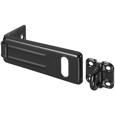 General description The Master Lock 704EURDBLK is a durable 115mm hard wrought steel hasp with a matte black finish, designed for securing various items such as sheds, garages, doors, and storage containers. It features a hardened steel padlock eye that accommodates shackles up to 13mm in diameter, providing a strong deterrent against theft. Technical specifications Body length: 115 mm Shackle diameter: 13 mm Material: Hardened steel with zinc plating Finish: Matte black Compatibility and accessories Compatible with shackles up to 13 mm in diameter Includes a mounting kit for easy installation Installation Mount the lock using the included mounting kit for secure attachment Usage Use to secure gates, lockers, storage units, or other items requiring padlock security Other information