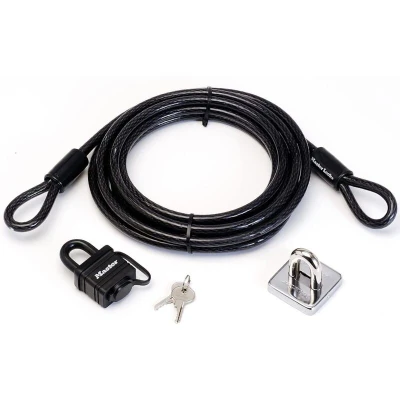 General description Master Lock Garden Security Kit is a comprehensive solution designed to secure your garden furniture and equipment. It includes a braided steel cable, a weather-resistant padlock, and an anchor point, allowing you to link multiple items securely. Technical specifications Length of cable: 4.5m Length of shackle: 30mm Thickness of cable: 10mm Colour: Black Security level: 6 Guarantee: Lifetime guarantee included MPN: 8271EURDAT EAN: 3520190934703 Usage The kit is suitable for outdoor use, providing a reliable way to secure your garden items. Other information
