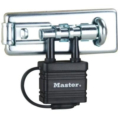 General description This Master Lock Bolt Hasp with integrated lock is designed to provide reliable protection against theft and opportunist thieves. It is suitable for securing cabinets, gates, fences, sheds, workshops, and garages, featuring a sturdy padlock and a reinforced hasp for secure locking. Technical specifications Hasp length: 110mm Padlock body: 40mm laminated steel with weather tough thermoplastic cover Padlock body material: chrome-plated steel Shackle material: hardened chromed steel, resistant to corrosion and cutting Shackle compatibility: suitable for hasps and locks with a maximum diameter of 11mm Supplied with 2 keys Fixings included Installation Easy to install with standard tools Designed for outdoor environments, resistant to weather conditions Usage Ideal for securing gates, fences, sheds, garages, and storage units Provides anti-theft protection with high resistance to tampering and cutting Other information
