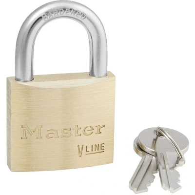 General description Master Lock V Line brass padlocks are designed for everyday use in various applications such as lockers, trunks, cupboards, sheds, residential gates, and storage units. This 40mm brass padlock features a solid brass body and cylinder for enhanced resistance to weather and corrosion. It is supplied with two keys and offers a lifetime warranty against mechanical failure. The case-hardened shackle resists sawing and filing, while the pin tumbler cylinder provides resistance against picking. Technical specifications Body Width: 40mm Shackle Diameter: 6mm Shackle Height: 22mm Shackle Width: 20mm Material: Brass body and cylinder Shackle Material: Case-hardened steel Number of Pins: 4 Key Type: Keyed alike (same key opens multiple locks) Compatibility and accessories Supplied with 2 keys Compatible with standard padlock accessories for security and storage needs Installation Insert the shackle through the hasp or latch Secure the lock by locking the shackle into the body