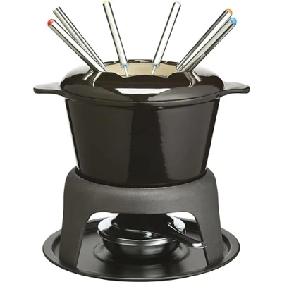 ManoManoGeneral description Stylish black cast iron deluxe fondue set ideal for use when entertaining. Suitable for cheese, chocolate, and even meat fondue. Technical specifications Durable cast iron contoured bowl that retains heat for longer Versatile burner compatible with methylated spirits or fondue gel Adjustable flame function and snuffer Includes six colour-coded fondue forks