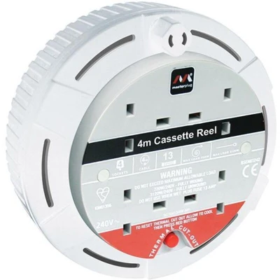 General description This Masterplug SCT04134W 240 Volt cassette cable reel is designed for both indoor and outdoor use, providing a safe and reliable power extension. It features a thermal cut-out to prevent overheating, a safety reset button, and four sockets for multiple devices. With four meters of 13-amp arctic cable, it is ideal for various DIY and home improvement tasks. Technical specifications Length: 4 meters Number of sockets: 4 Cable type: Arctic cable, 13 amps Manufactured to: BS EN 61242 Compatibility and accessories Compatible with standard 240V power outlets Includes safety reset button and thermal cut-out for protection Installation Unroll the reel to the desired length Plug into a suitable 240V power outlet Ensure the safety reset button is engaged before use Usage Use to power multiple devices simultaneously in home, garden, or workshop environments Do not overload the sockets beyond 13 amps Regularly check the cable and reel for damage before use