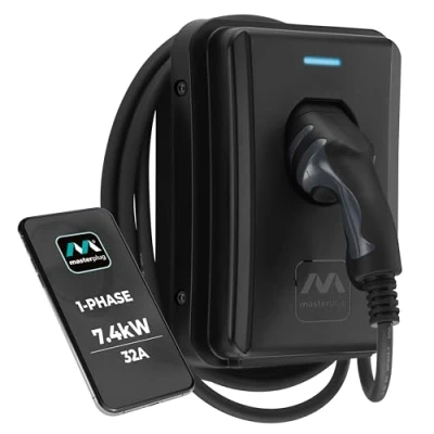 A MODE 3 EV HOME WALL CHARGER WITH TETHERED DESIGN, LED INDICATOR AND 5M CABLE: With a black finish, it supports single-phase dynamic fast charging with up to 7.4kW (32A) power output. Suitable for all Type 2 electric and plug-in hybrid vehicles FULL SMART CHARGING VIA THE SYNC APP: With Wi-Fi, LAN and Bluetooth, it lets you tailor your EV Smart Charging needs. Monitor your charging status, schedule and optimise charging sessions, take advantage of off-peak electricity rates and track usage SUITABLE FOR INDOOR AND OUTDOOR USE: Designed to withstand all weather conditions with IP55 weatherproof and dust resistant rating. Operates between temperatures -20°C and+55°C. Integrated solar function which utilises excess solar power for charging INTEGRATED SAFETY PROTECTION: Preventing electric shocks, leakage, and fire risks ensuring user and device safety - these include overload, short-circuit, and overheating protection. Compliant with EV Smart Charge Point Regulations QUICK & EASY INSTALLATION WITH UK BASED TECHNICAL SUPPORT: From Masterplug, It has a four-point fixing with horizontal and vertical adjustment and is supplied with fixing hole template. Includes 3-year manufacturer's warranty, Weight: 8.157103694 pounds, Manufacturer: Masterplug