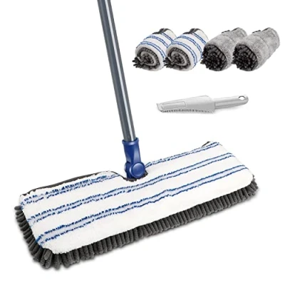 【2-in-1 Floor Mop for Versatile Cleaning】This flat mop is designed for both dry and wet use, making it a versatile tool for all your cleaning needs. It comes with 4 microfibre & chenille pads and a dust scraper. Use the chenille pad for dry sweeping to trap dust and pet hair, and the microfibre pad for wet mopping and deep cleaning. The dust scraper helps remove dirt from the mop pad, keeping your hands clean. Ideal for maintaining laminate, hardwood, and tile floors. 【360° Rotating Flat Mop Head】This floor cleaning mop features an ultra-slim flat mop head with a 40cm x 13cm area, ensuring efficient cleaning. The 360° rotating head makes it easy to reach under sofas, cupboards, beds, and other hard-to-reach corners. Say goodbye to the hassle of cleaning tight spaces and enjoy a seamless cleaning experience. 【Adjustable Handle】These mops for cleaning floors with an adjustable handle, offering two height settings (127 cm or 86.36 cm). This feature allows you to relieve back strain during housework and is especially friendly for the elderly and children. You can also use this flat mop to clean higher areas like window panes or brush dust off large furniture. 【Suitable for a Variety of Surfaces】This 2-in-1 floor mop is suitable for cleaning a wide range of surfaces, including hardwood, laminate, tile, vinyl, and more. Whether you need to pick up dust or clean up spills, this microfibre mop delivers excellent results. Use it at home, in the workplace, schools, restaurants, or with a floor cleaner for maintenance.maintenance. 【Reusable & Machine Washable Pads】The floor mops for hard floor include 4 reusable and machine washable pads, designed for both wet and dry cleaning. Each pad is durable, resistant to damage and deformation, and won't scratch your floors. The touch fasteners make it easy to remove and replace the pads. Spend once and benefit for a long time! For replacement mop heads, search for ASIN: B07TBCMS2S.