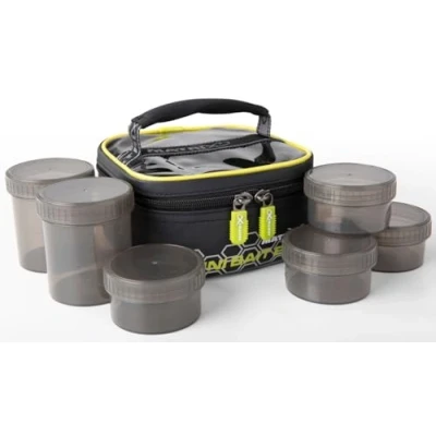 Matrix Mini Bait Bag - Bait storage bag - Dimensions: 17cm x 17cm x 9cm - Firmly lined - Waterproof - Easy to clean - Transparent grey PVC lid - Removable dividers - Includes 6 plastic jars (in 2 sizes) - Screw caps - Ideal for hookbaits, pellets, liquids, particles,… This handy storage bag from Matrix is ideal for storing your hookbaits and liquids. The waterproof bag is easy to keep clean, with a firm lining and zipper closure. The lid is transparent to quickly find what you need. You also receive six jars with a screw cap to store your bait. The bag can be divided with the removable dividers.