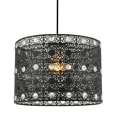Traditional and Moroccan designed unique easy fit pendant light shade in a matte black finish. Features multiple small circular decorative clear acrylic beads which give off an eye-catching crystal glass effect when light shines through. Total product dimensions: Height - 17cm, Width - 24cm, Depth: 24cm. Maximum wattage allowed is 11w. Please note that ceiling rose and cable is not included - pendant shade only being sold. Complete with shade reducer ring allowing for most lamp bases - B22/BC, E14/SES and E27/ES. Light bulb is not included., Weight: 2.645547144 pounds, Manufacturer: Happy Homewares