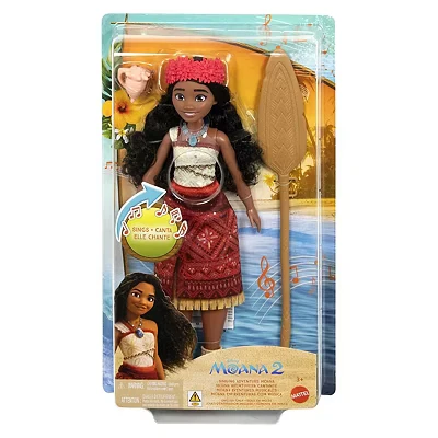 This Singing Adventure Moana Doll, inspired by Disney’s Moana 2, is ready to sing and answer the ocean’s call Press her torso to hear a clip from the English version of the original song, We’re Back”, from the theatrical sequel, Disney’s Moana 2 The doll bends at the arms, head and legs so she is ready for endless play possibilities, on land or at sea Moana wears her true-to-movie adventure outfit with beautiful, wavy hair and 4 accessories -- a flower crown, oar, conch shell and necklace Fans will want to collect all the Disney Moana 2 fashion dolls to dream up adventures in Motunui and beyond, Each sold separately, subject to availability, Manufacturer: Mattel