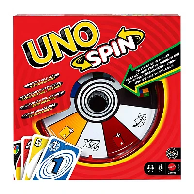 UNO Spin offers a revolutionary take on the classic game of UNO with a spinner that can change the game! Players take turns playing their UNO cards, but when the spin card is played, they spin the wheel and follow the instructions. With different commands like Color Draw, Swap Hands, Color Discard and Double Spin, the game can take a complete turn. Special graphic symbols added to each card help identify the color(s) on that card, allowing players with any form of color blindness to play! Everyone in the family ages 7 years old and up participate in the frenzy that evolves with UNO Spin!, Manufacturer: Mattel