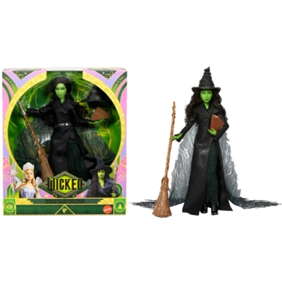 The Wicked Elphaba World Fashion Doll features Elphaba in a movie-accurate, sparkly gown with a cape, hat, broom, Grimmerie, and boots. With 11 points of articulation, this collectible doll is perfect for children aged 6+ to play or display and brings the magic of Wicked to life.
