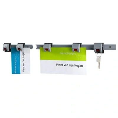 Notes and information can be attached to the light grey plastic wall strip with 4 roll clips. Whether at work or at home, the roller clip wall bar is ideal for attaching plans, posters or lists. Thanks to the automatic clamping function and by moving the clips, a wide variety of formats can be hung up easily. The automatic roller clip mechanism allows to hang-up and hold reliably thicker paper The wall rail can easily be fixed to the wall with the supplied nails, several rails can be mounted in line to create a visualization stripe.