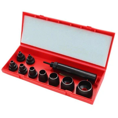 General description This versatile Maun 1001-05 Imperial Wad Punch Kit includes nine different-sized punches designed for precise hole and shape cutting in various soft materials. It is ideal for making gaskets, washers, and other components with accuracy and ease, making it suitable for both professional craftsmen and DIY enthusiasts. Technical specifications Punch sizes (diameter): 1/4", 5/16", 3/8", 7/16", 1/2", 5/8", 3/4", 7/8", 1" Material: Hardened steel with rust-proof finish Handle: Heat-treated for durability and comfort Case: Lightweight polypropylene storage box Punch hardness: HRC 45 Handle hardness: HRC 57 Compatibility and accessories Works on soft materials such as felt, rubber, leather, plastic, and cork All punches fit onto a single handle for quick and easy changing Installation Interchangeable punches screw onto the handle securely Ensure punches are properly tightened before use The handle should be struck with a hammer or mallet onto a wooden block Usage Use the