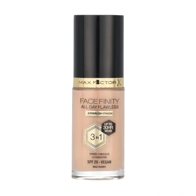 Max Factor Facefinity All Day Flawless 3 In 1 Foundation (N42 Ivory) is a vegan, 3-in-1 formula combining primer, concealer, and foundation for up to 30 hours of flawless, climate-proof wear. It offers SPF20 protection, a matte finish, and is available in 33 shades to match your complexion.