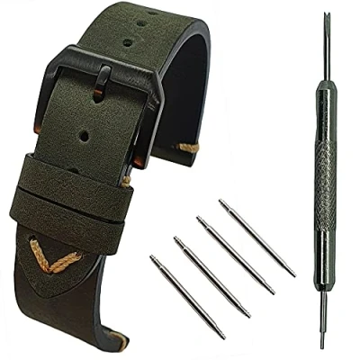 Max Genuine Leather Watch Strap Crazy Horse/Oil Wax Vintage for Traditional and Smartwatch (22mm, Khaki Green Horse)