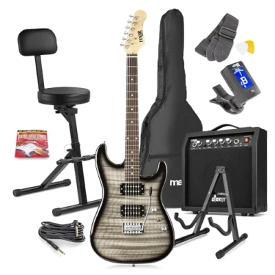 Complete Electric Guitar Kit: Includes a stylish quilted maple top electric guitar with 22 frets, basswood body, smooth tremolo system and die-cast tuners, ideal for beginners and improving players. Premium 40W Amplifier: Provides fantastic sound clarity and adjustable controls for bass, mid, treble and gain—perfect for home practice or performing live, with headphone jack for silent rehearsing. Comfortable Guitarist Stool: Features a robust and adjustable frame with padded seat and backrest, convenient integrated guitar stand and foldable design, allowing ergonomic comfort in long sessions. Convenient Accessories Included: Comes with essential gear including digital tuner, spare strings, shoulder strap, picks, gig bag and cable, ensuring immediate playability straight from the box. Stable Guitar Stand Addition: Robust metal A-frame guitar stand complements this pack, providing reliable and scratch-proof storage for your electric guitar at rehearsals, gigs, or studio sessions.