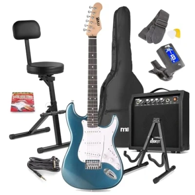 Ultimate Beginner Guitar Set: This complete beginner electric guitar package includes a stylish blue guitar, 40W amplifier, foldable guitar stool and sturdy guitar floor stand for immediate playing. Powerful 40W Amplifier: The included compact amplifier delivers clean melodies to vibrant rock distortion, featuring independent volume and three tone controls plus a 5-way pickup selector switch. Comfortable Folding Guitar Stool: Adjustable guitar stool with padded seat, removable backrest, and footrest offers ergonomic support, allowing relaxed posture during practice sessions or performances. Reliable Guitar Floor Stand: Foldable metal A-frame stand safely accommodates most guitar types securely, protecting instruments from scratches with stable balance and soft rubber padding supports. Perfect Starter Bundle: With essential extras like digital clip tuner, spare strings, tremolo arm, guitar strap, picks, carry case and cables, this all-inclusive set makes an ideal gift for beginners.