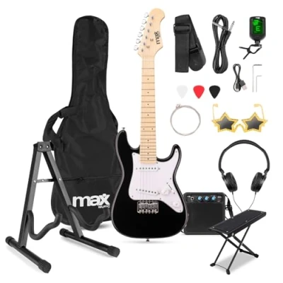 All-in-one 1/4 size electric guitar package thoughtfully designed for kids and beginners, combining a compact 21-fret guitar with ergonomic foot rest and universal A-frame stand for ideal comfort and practice support Perfect starter kit offers classic single-coil tones, robust 10W amp, and easy 3-way pickup selector, delivering sparkling cleans and rock crunches for home, lesson, or school environments – right out of the box Practice sessions are consistent and safe thanks to a sturdy adjustable foot stand and a universal guitar stand, ensuring comfortable playing posture and secure storage between lessons or jam sessions Complete package includes handy extras: soft case with straps for travel, clip-on digital tuner for quick tuning, two picks, spare strings, connection lead, strap, plus cool Rock Star sunglasses to keep kids inspired Lightweight, reliable metal stands with rubber non-slip surfaces prevent slips and protect floors – everything folds for portability, simple storage, and makes setup effortless whether at home or on the go