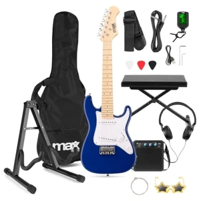MAX GigKit Junior 1/4 Electric Guitar with Adjustable Music Stool & Foldable Stand, Blue Kids Beginner Kit, Comfortable Practice Setup Small Size Instrument, For Home Lessons