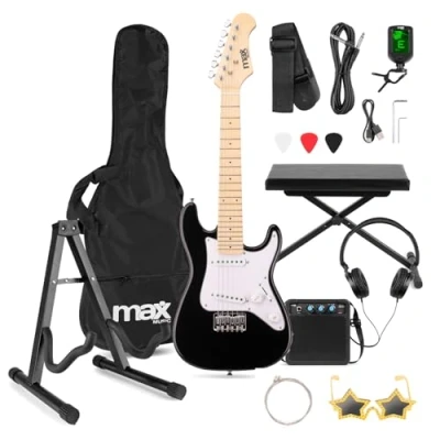 Fully integrated 1/4 size electric guitar set designed for kids and young beginners, offering a practice-ready experience with comfortable stool, sturdy stand and everything needed to start playing instantly. Beginner-friendly guitar ensures proper posture and playability with its compact scale, making it perfect for children or adults with smaller hands seeking a reliable musical instrument for learning and progress. Robust 10W amplifier and overdrive selector deliver authentic, clean tones and classic rock sounds, letting novice players explore various genres and musical styles right from their first session. Height-adjustable padded stool combined with a lightweight, foldable stand creates a dedicated, professional-grade mini studio setup in any home or classroom for consistent, stable practice sessions. Complete with soft case backpack, clip-on digital tuner, headphones, spare strings, strap, picks, guitar cable, setup tools and fun Rock Star sunglasses, ensuring a seamless and enjoyable learning experience from day one.
