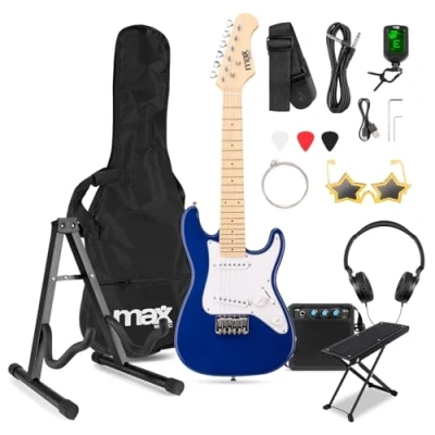 MAX GigKit Junior 1/4 Size Electric Guitar Starter Package with Foot Stand & Universal Kids’ Beginner Kit Blue, 21 Frets, Complete Accessories for Young Players, Perfect Small Hands