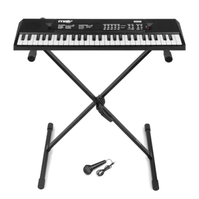 Complete electronic keyboard set features 54 velocity-sensitive keys paired with a folding steel stand, making setup simple and storage effortless – perfect for learners and kids ready to play anywhere, anytime Built-in rechargeable battery gives up to 8 hours’ operation, freeing players from power sockets and letting you create music wherever inspiration strikes – at home, class, or on the go Integrated speaker system provides clear, rich sound suited for practice sessions or small performances while convenient volume control and record/playback enhance your musical experience Included wired microphone enables singing along or recording vocal ideas, while intuitive controls, demonstration songs, and multiple sounds provide hours of enjoyment for children and beginners alike Robust, adjustable folding stand ensures stability for different heights, yet collapses for compact storage under beds or in wardrobes – ideal for space-limited bedrooms or classroom music corners