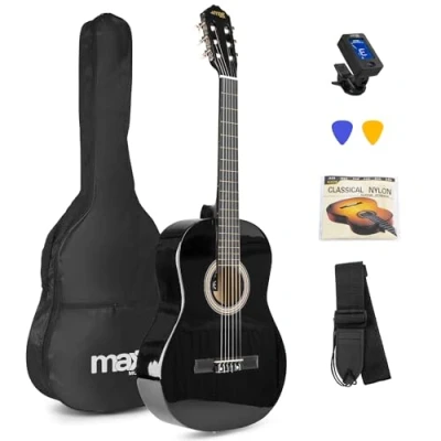 Full Size Classical Guitar for Beginners - Ideal for students and adults, this classical guitar provides a smooth learning experience with nylon strings and a rich, warm acoustic tone. Complete Beginner Acoustic Guitar Kit - This kit includes a sturdy gig bag, guitar strap, extra strings, digital tuner, and picks, offering everything needed to start playing right away. Lightweight & Comfortable Design - Designed for ease of play, this beginner acoustic guitar is lightweight and easy to handle, making it perfect for long practice sessions. Durable Quality & Beautiful Tone - Built with a solid wood top, this classical guitar delivers reliable quality and beautiful tone, making it ideal for classical and acoustic styles. 6 Months Online Lessons – Enjoy six months of online lessons, perfect for beginners to learn essential techniques and grow confidence on their classical guitar journey.