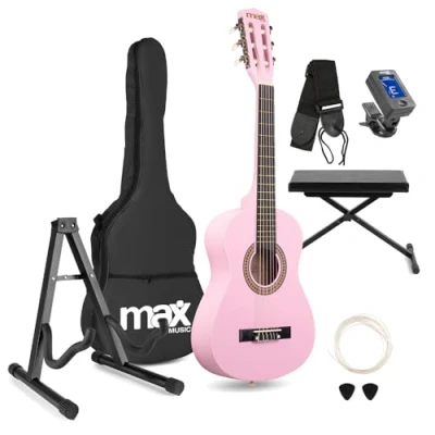 Spark creativity with a 1/4 size acoustic guitar in vibrant pink, tailored for young beginners. Nylon strings are gentle on small fingers, ensuring hours of comfortable play and practice with every strum. This complete learning bundle transforms practice time into an engaging experience. The reliable junior guitar provides classic sound, while the adjustable bench and stable stand create an ideal, child-friendly setup. Lightweight, portable, and practical, the included stool adjusts for a perfect playing position, encouraging good posture from day one. The foldable guitar stand keeps the instrument safe and off the floor. Every essential is included—from a soft gig bag for carrying to spare strings, picks, a strap and a clip-on digital tuner. No need to buy extras. Parents, guardians or grandparents will set up kids to start right. Thoughtfully designed for smaller hands and starting musicians, this kit is playable and tunable, offering a fun way to learn the basics at home, lessons or performances—an ideal first step in music.