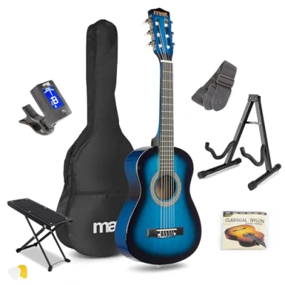 Max SoloArt Junior 1/4 Size Beginner Acoustic Guitar Set Blue with Foldable Stand, Foot Rest, Nylon Strings, Tuner & Accessories Ideal for Kids Learning Classical