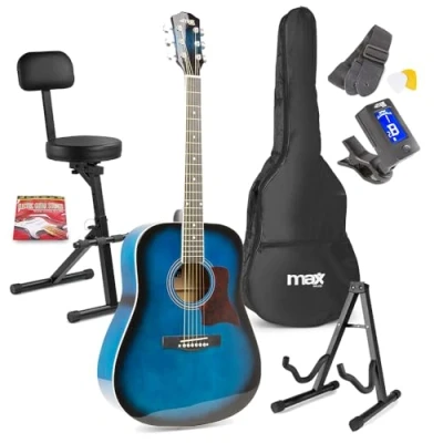 Complete Acoustic Guitar Beginner Pack – Full-size western design guitar with 21 comfortable frets for learning chords and melodies, ideal starter set including guitar stand and folding stool with backrest. Enhanced Comfort & Stability – The sturdy folding musician stool features padded seat, dual-height adjustable footrest and removable backrest, perfect for practising guitar comfortably for hours. Integrated Guitar Stand – Robust A-frame guitar stand safely stores and showcases your acoustic guitar, constructed from lightweight metal with protective rubber padding for scratch-free stability. Ready to Play Accessories – Includes accurate digital clip-on tuner, spare set of acoustic steel strings, two durable plectrums, carry gig bag, and adjustable guitar strap for instant out-of-box use. Free Online Lessons Included – Learn guitar faster with 6 months complimentary Gigajam online tuition, providing beginner-friendly video tutorials, simple instructions and interactive exercises.
