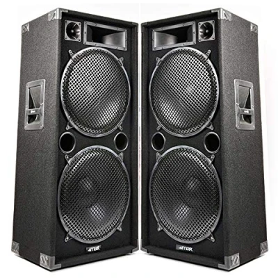Deliver impressive sound at any event with this pair of 15-inch passive DJ PA speakers, engineered for powerful bass and crisp highs—ideal for clubs, karaoke, live music, and mobile DJ setups. Versatile PA system delivers clear, high-volume sound with 4000W peak power—dual woofers ensure deep low-end, while the bullet tweeter and mid horn add punchy mids and sharp treble for any application. Rugged, carpet-covered cabinets with built-in handles stand up to transport and handling, perfect for busy event calendars—just pair with your favourite amplifier and start performing anywhere. Compatible with most amplifiers and setups, these passive DJ speakers excel in pub, club, and party environments, making them a go-to for DJs, venue managers, and karaoke hosts needing reliable output. 100dB SPL rating offers plenty of volume without distortion—dual jack plus terminal inputs support straightforward, secure connections, making setup quick and managing sound almost effortless.