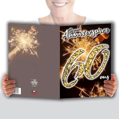 MAXI MX 5060 Large XXL Giant Card for 60th Birthday Mixed H/F + Envelope Format 32 x 23 cm Golden Number Numbers Celebrating Fireworks Sparkling Champagne Cap Made in France