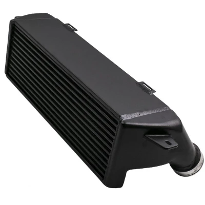 General description Black Turbo Intercooler designed for BMW 3 Series E90 330d, 335d, and Cabriolet E93 models. This intercooler enhances the performance of turbocharged and supercharged internal combustion engines by improving volumetric efficiency and increasing intake air charge density through effective cooling. It is a direct replacement part that ensures easy installation and is made from high-quality materials for long-lasting durability. Technical specifications Max horsepower capacity: 500HP+ Intercooler dimensions: 520mm x 200mm x 145mm Core dimensions: 510mm x 130mm x 110mm Core thickness: 5" Inlet/outlet size: 3.25" End to end length: 27" (approx.) Weight: 9.2kg Material: cast aluminium Volume: 13000 cm³ Power coated in black with aluminum end tanks 50% more volume air flow than OEM intercooler Compatibility and accessories This intercooler is compatible with the following BMW models: BMW 3 Series E90 330d (2004/09-2008/08, 2008/02-2011/12) BMW 3 Series E90 335d