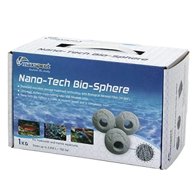 MAXSPECT Nano Tech Bio Spheres 1 kg / 40 – 44 Pieces Bio Balls for External Filter, Waterfall, Sump Freshwater and Marine Aquarium Stabilised microbial wastewater treatment technology with biological aerated filter (W-BAF). Cross-sectional area ratio to ultra-high filter surface. Nano-Tech Bio-Sphere is made of ceramic beads and is completely inert. Nano-Tech Bio Sphere are suitable for fresh and marine water. Use directly in the tub, sump, external filters, waterfalls, etc. Diameter: 3 cm Weight: 1 kg Number of pieces: approx. 40 - 44
