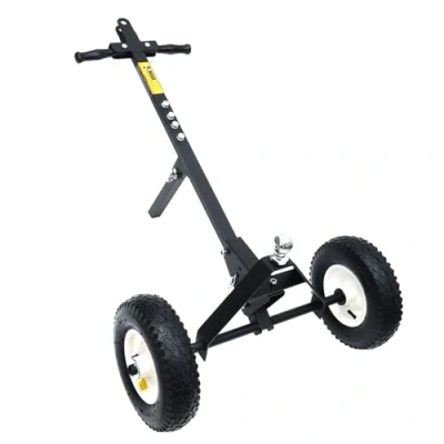 Converts between towing position and manual position in minutes Long handle provides leverage allowing maximum maneuverability Features two 12" diameter x 4" wide pneumatic, all terrain knobby tires on sturdy steel rims 5/8" pin hole connection, 1-7/8" ball size; Capacity: 600 lbs maximum Distance from center of hitch ball to handle: 43"; from top of hitch ball to ground: 17"; Off-road used only Patent Pending