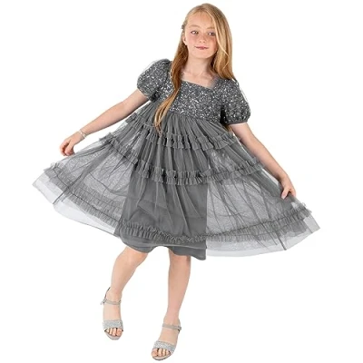 Maya Deluxe Girl's Midi Dress Sequins Embellished Short Sleeves Party Tutu Ruffles Frilly Bridesmaids Wedding Kids Children, Charcoal, 7 8 Years
