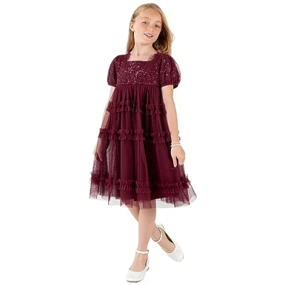 Maya Deluxe Girl's Midi Dress Sequins Embellished Short Sleeves Party Tutu Ruffles Frilly Bridesmaids Wedding Kids Children, Red Berry, 3 4 Years