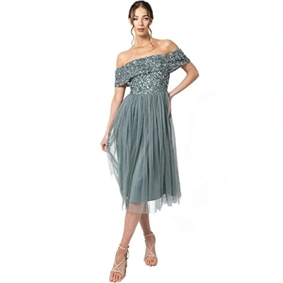 Maya Deluxe Women's Ladies Bardot Dresses Midi High Empire Waist Sequins Embellished Formal Evening for Wedding Guest Bridesmaid, Misty Green, 8 UK
