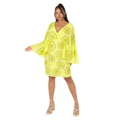 Maya Deluxe Women's Ladies Midi Dress Cape Sleeve Plunge V Neck Knee Length Floral Embellished A line for Wedding Guest Occasion Lime Green 26